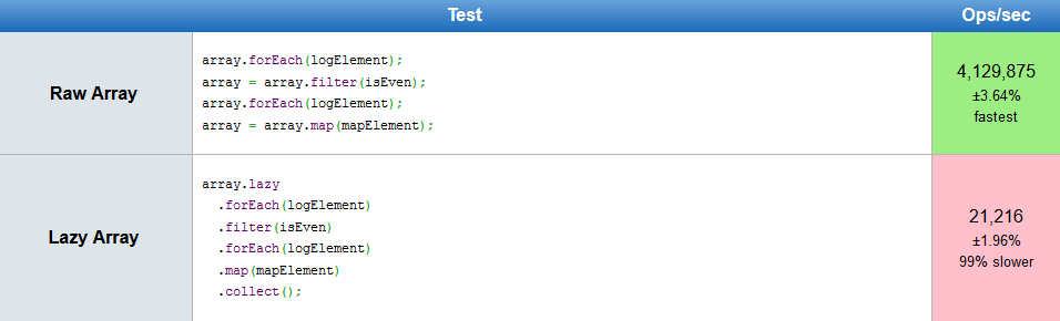 Le résultat, c'est que le comportement est bien celui attendu : les itérateurs sont bien appliqués, dans le bon ordre et à peu près dans le même contexte qu'avec les méthodes natives. Par conséquent, j'ai voulu regarder, avant d'aller plus loin en implémentant d'autres itérateurs, si ça avait un impact sur les performances.